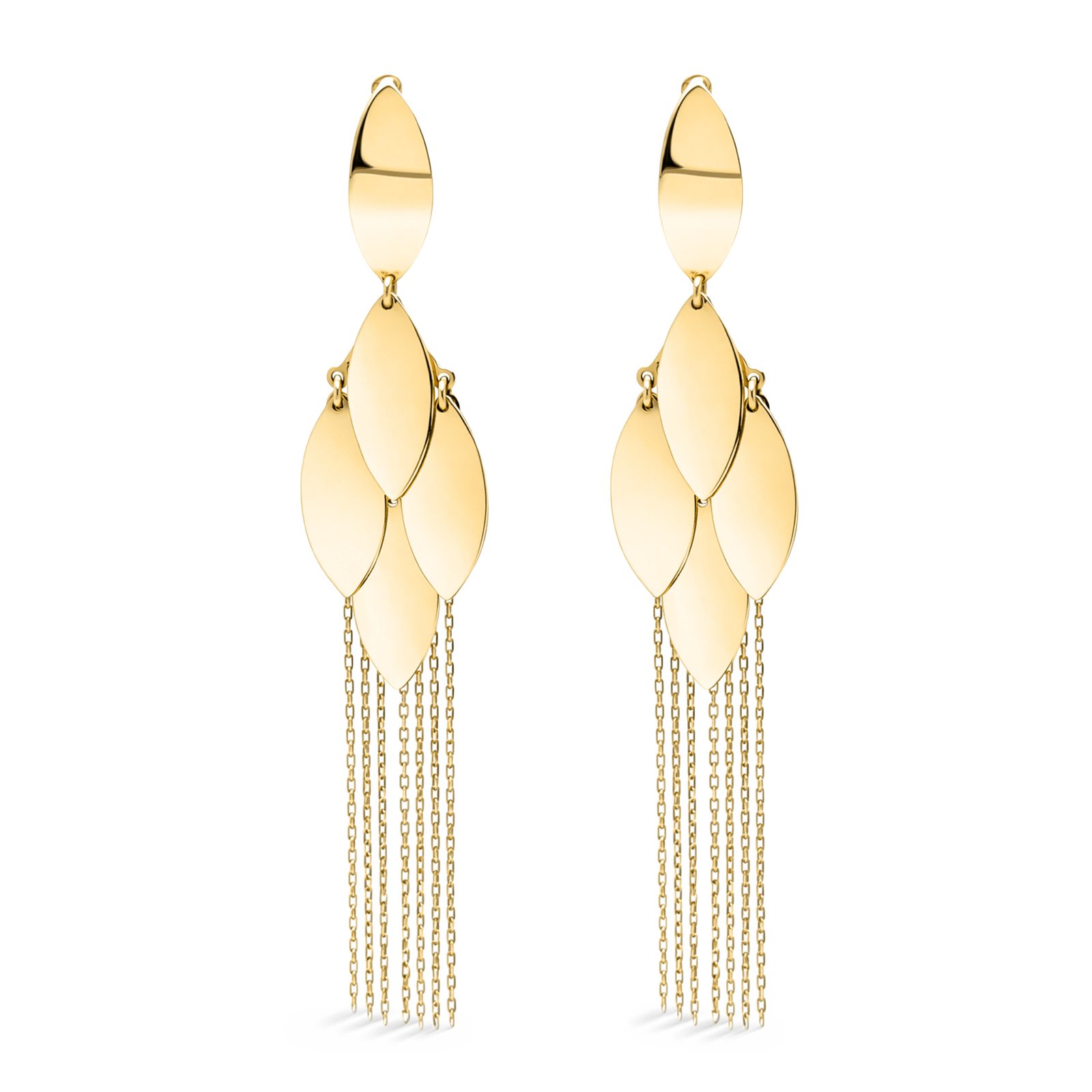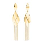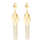 Acești cercei din aur de 14K impresionează prin designul lor alungit, cu elemente suprapuse și lanțuri fine care se mișcă delicat la fiecare pas. Modelul cu franjuri adaugă fluiditate și un aer modern, fiind o alegere perfectă pentru ținute elegante, seri speciale sau apariții statement.