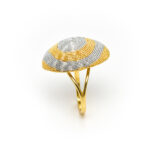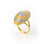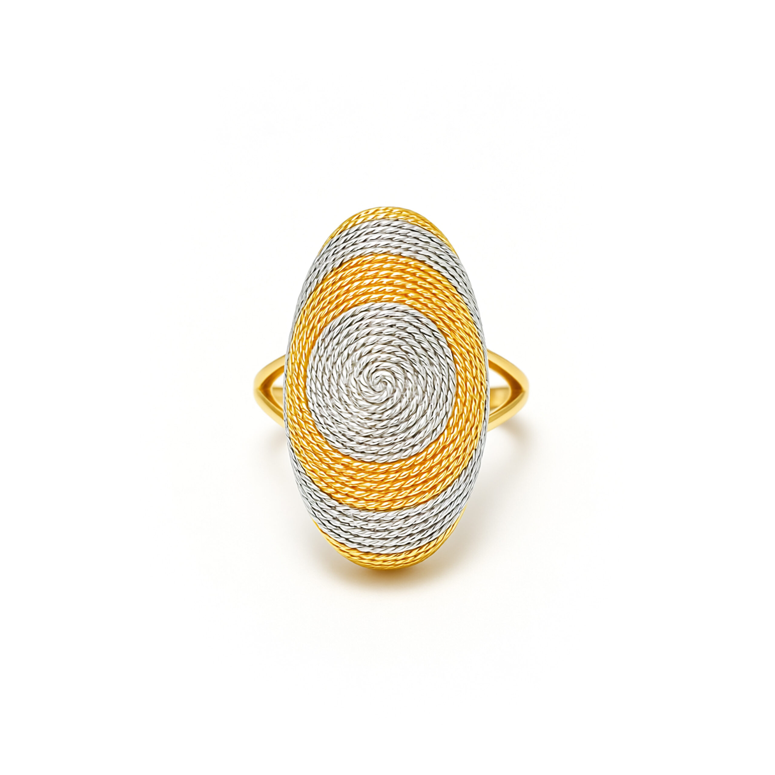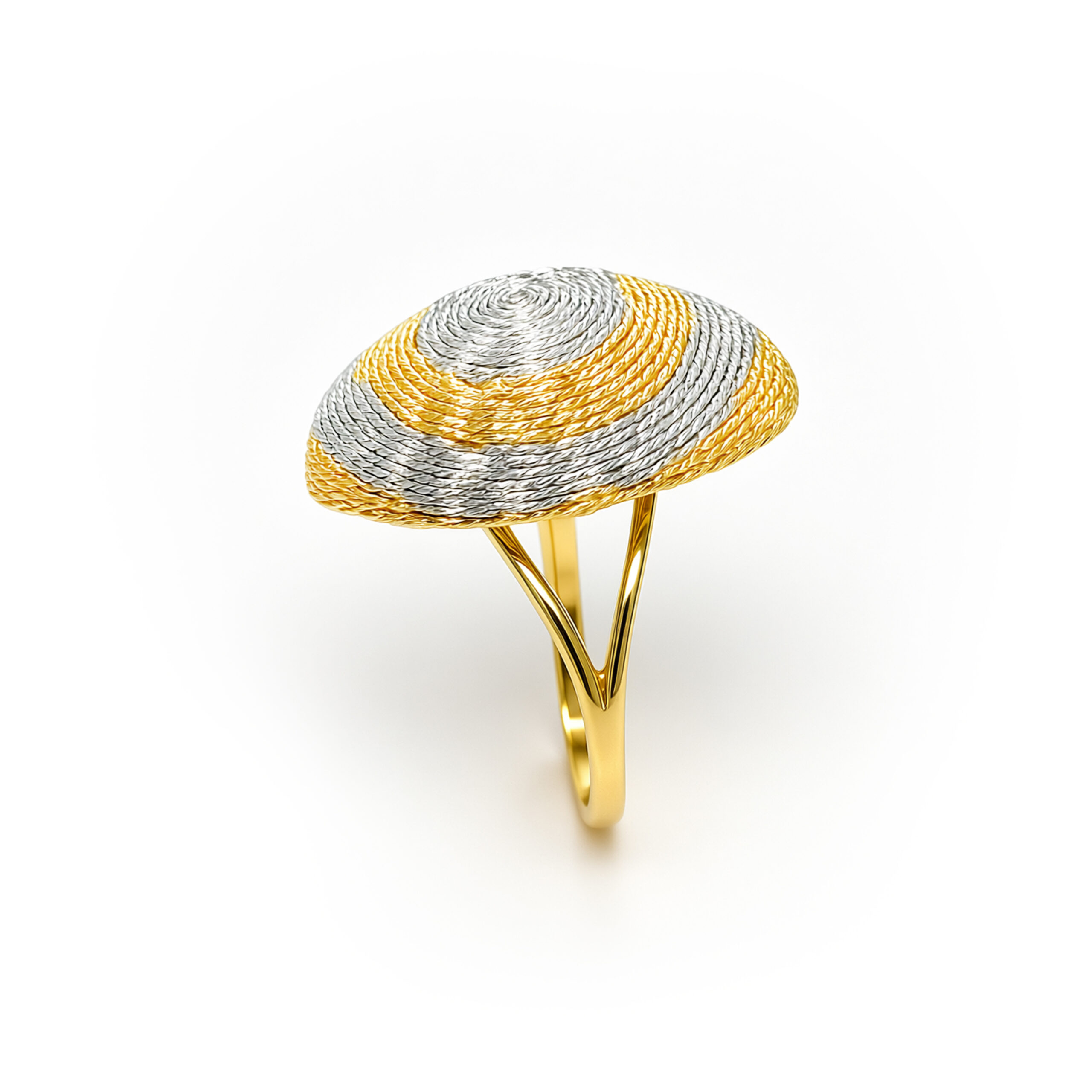 Acest inel bicolor din aur de 14K impresionează prin textura împletită în formă de spirală, care combină armonios tonurile de aur galben și aur alb. Partea superioară mare și sculpturală conferă un aspect artistic și puternic, transformând inelul într-o adevărată piesă statement.