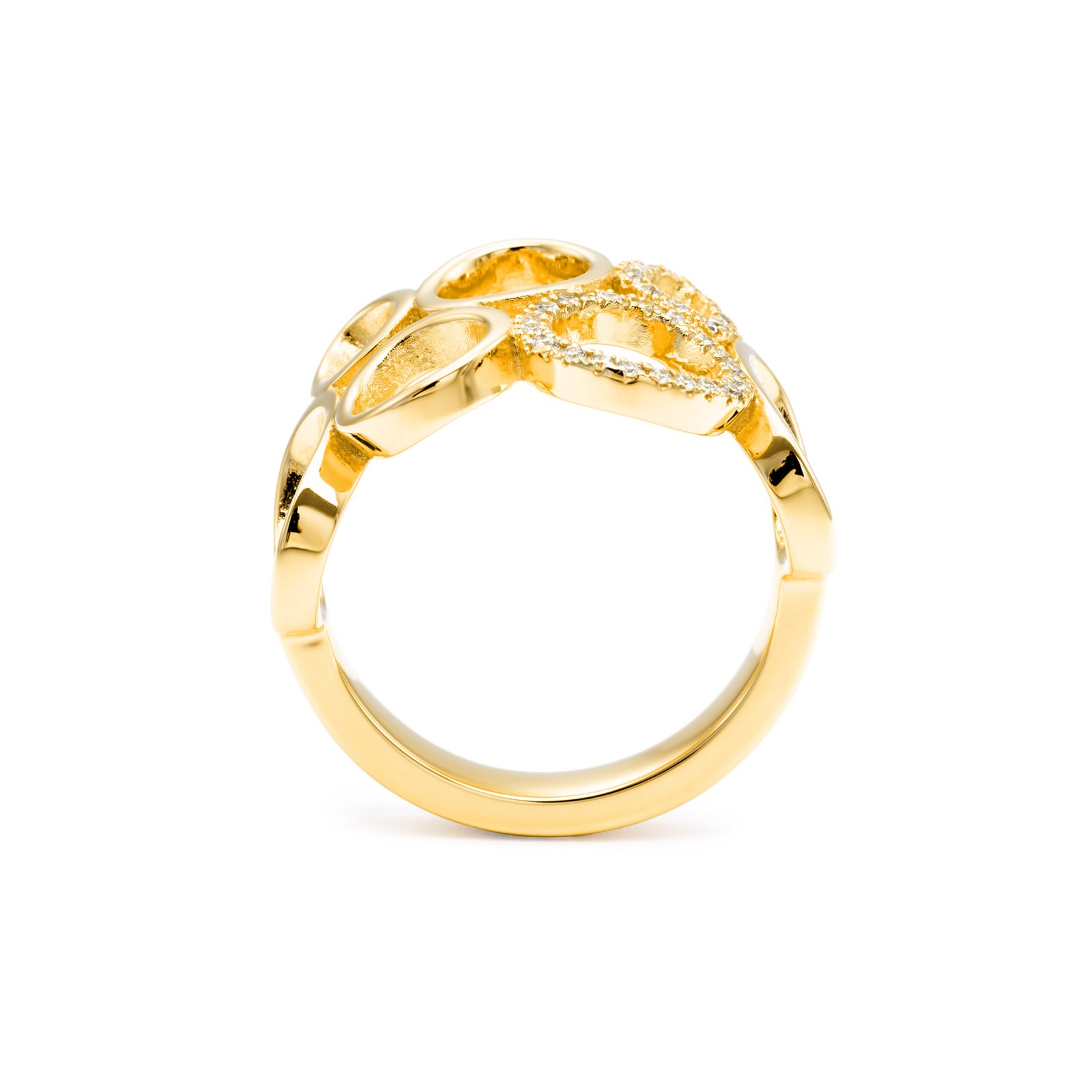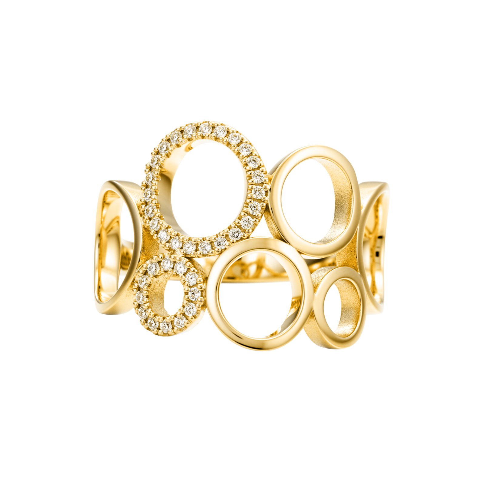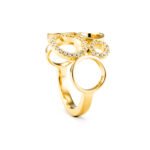 Acest inel din aur de 14K se remarcă prin designul său modern, format din cercuri interconectate, unele finisate lucios, altele accentuate cu pietre strălucitoare. Jocul dintre volume, gol și plin creează un efect vizual elegant și contemporan. Un model rafinat, ideal pentru femeile care apreciază bijuteriile cu personalitate și stil arhitectural.