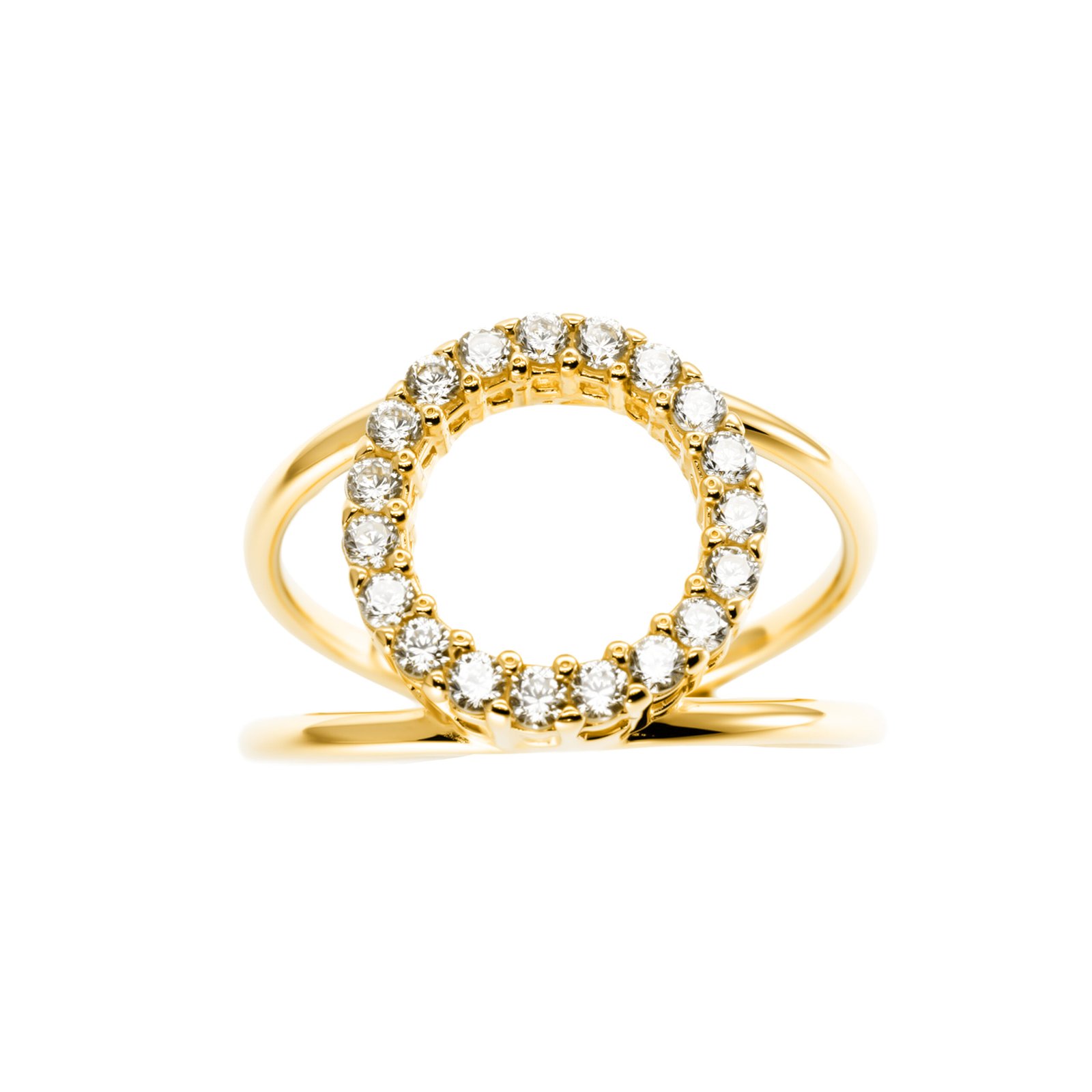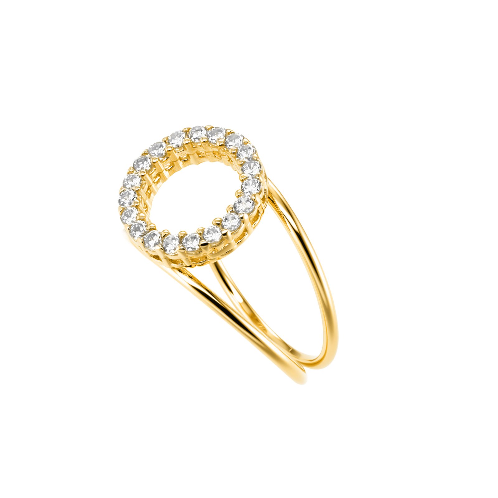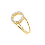Acest inel sofisticat din aur de 14K combină două benzi subțiri cu un element central rotund, decorat complet cu pietre semiprețioase montate fin. Designul dublu creează un efect modern și arhitectural, în timp ce cercul strălucitor adaugă un accent elegant și luminos. Liniile fine și proporțiile echilibrate îl fac ușor de purtat, dar suficient de special pentru a ieși în evidență. O piesă statement, ideală pentru iubitoarele de bijuterii moderne și rafinate.