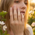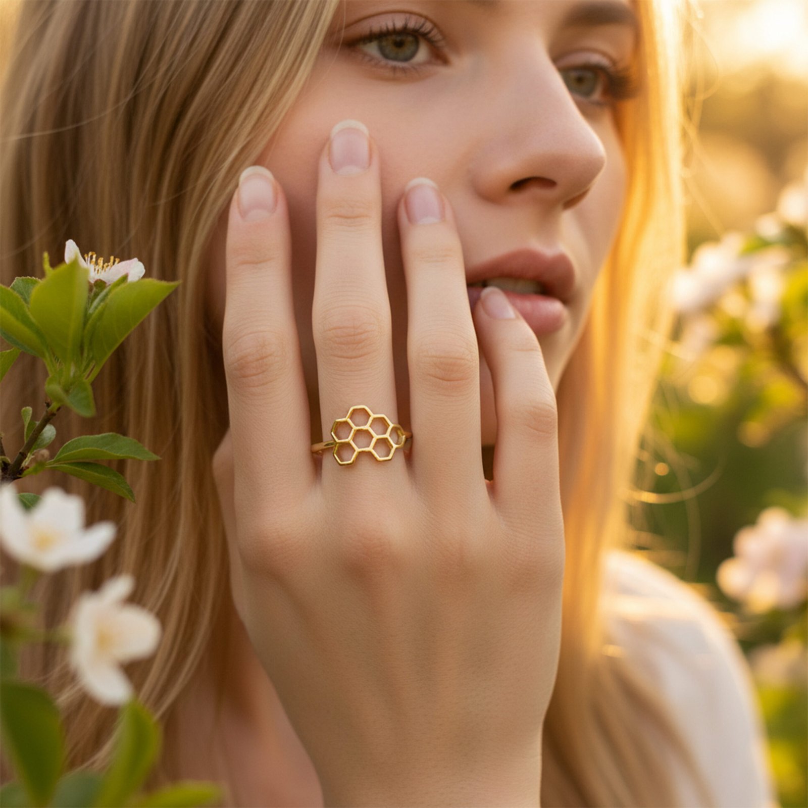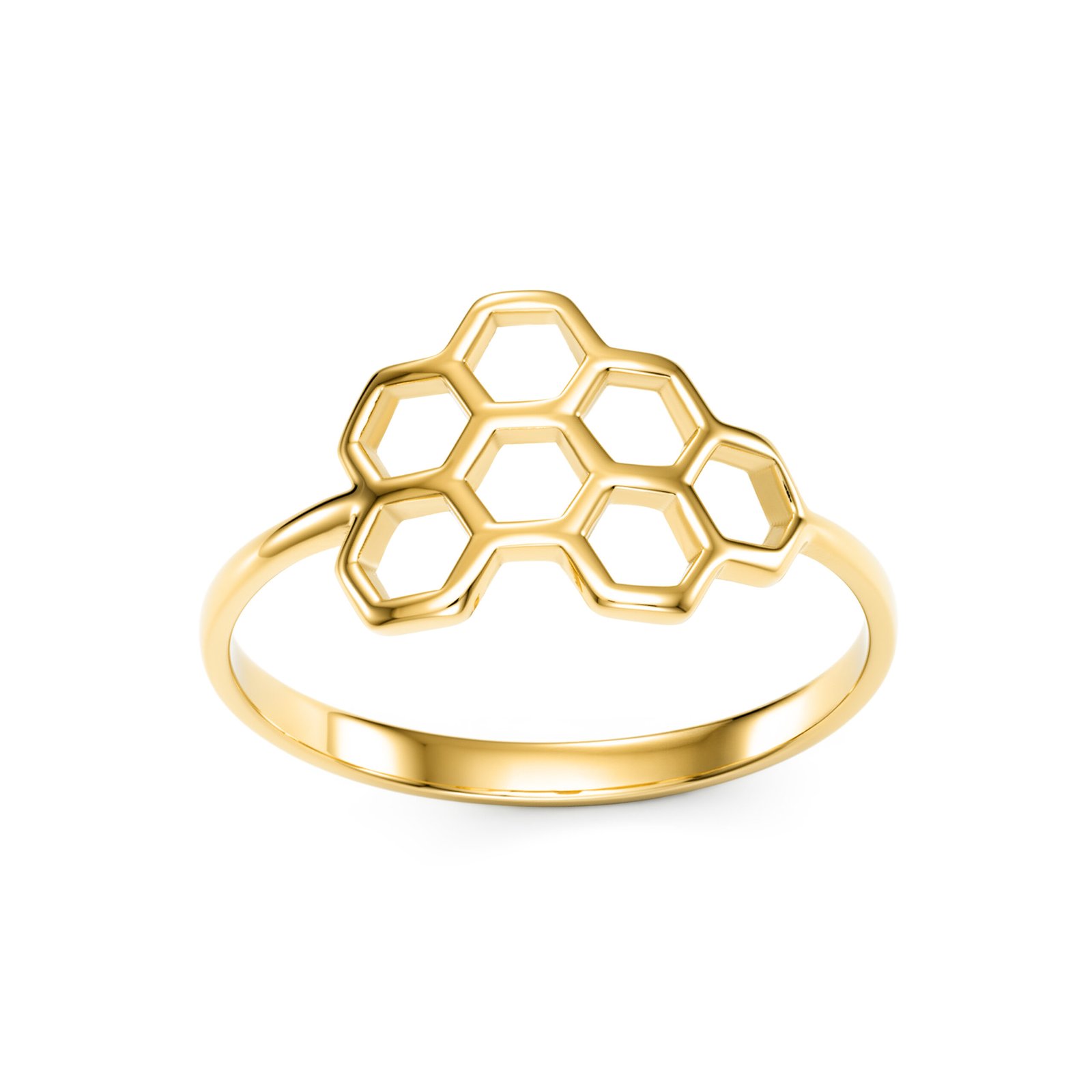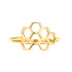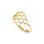 Acest inel modern din aur de 14K se remarcă prin designul său inspirat din structura fagurelui, cu elemente hexagonale dispuse elegant pe partea superioară. Liniile curate și silueta aerisită creează un aspect contemporan și ușor de purtat, ideal pentru iubitoarele de bijuterii geometrice. Finisajul lucios pune în valoare strălucirea caldă a aurului, transformând această piesă minimalistă într-un accesoriu distinctiv și sofisticat. Perfect pentru purtare zilnică sau pentru a adăuga un detaliu modern ținutelor clasice.