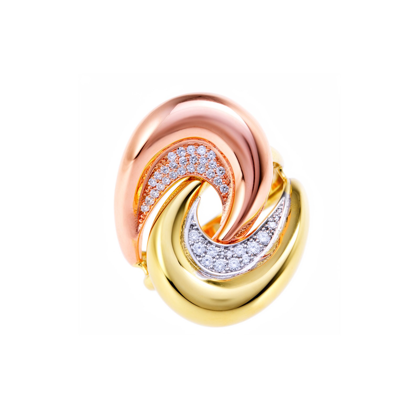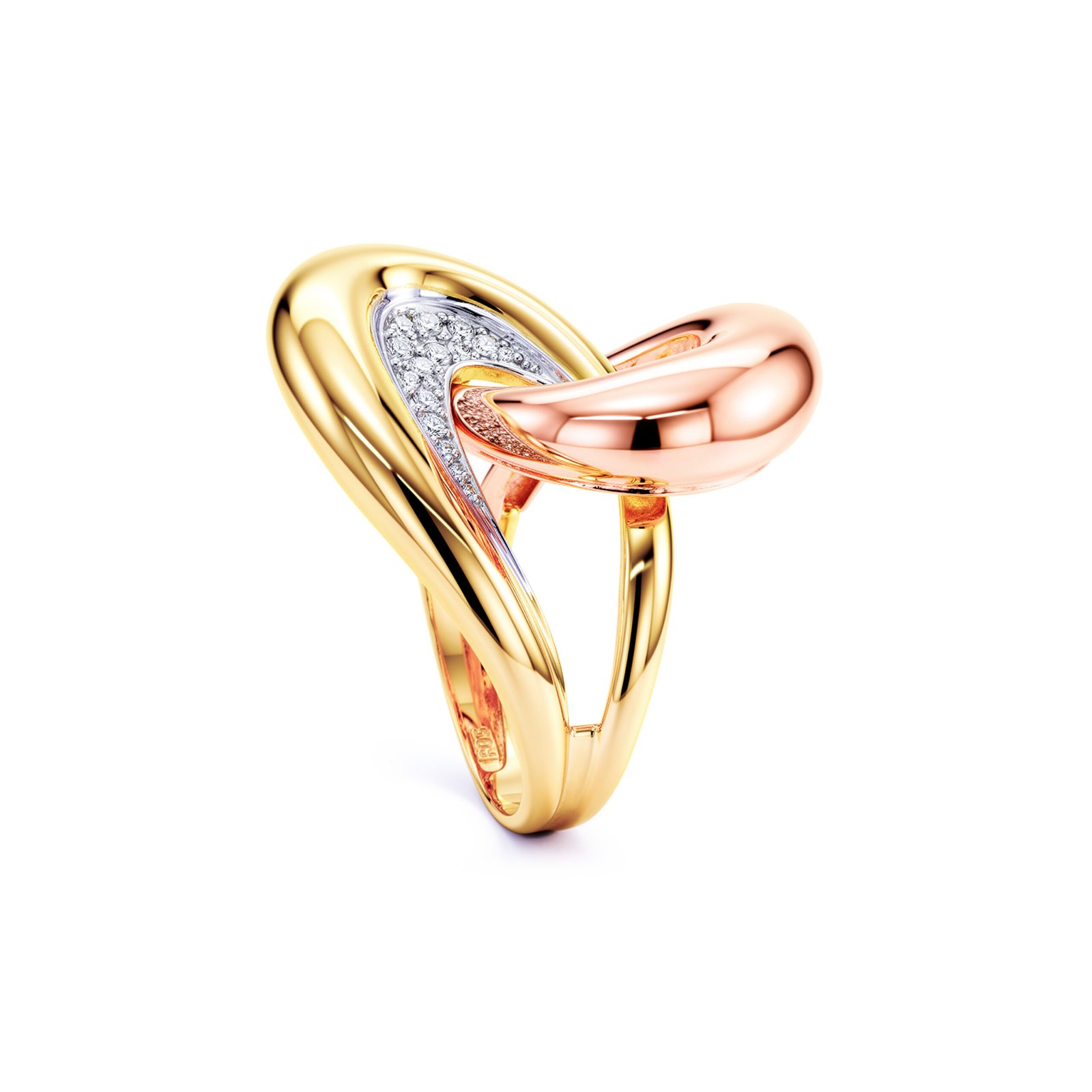 Acest inel din aur de 14K impresionează prin designul său fluid, cu volume interconectate ce creează un efect sculptural și modern. Jocul elegant dintre nuanțele de aur galben și aur roz oferă profunzime și dinamism, transformând piesa într-un accent sofisticat pe mână. Forma curbată și liniile netede conferă un echilibru perfect între forță vizuală și rafinament, fiind ideal atât pentru purtare zilnică, cât și pentru apariții elegante.