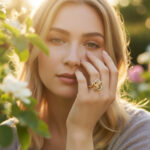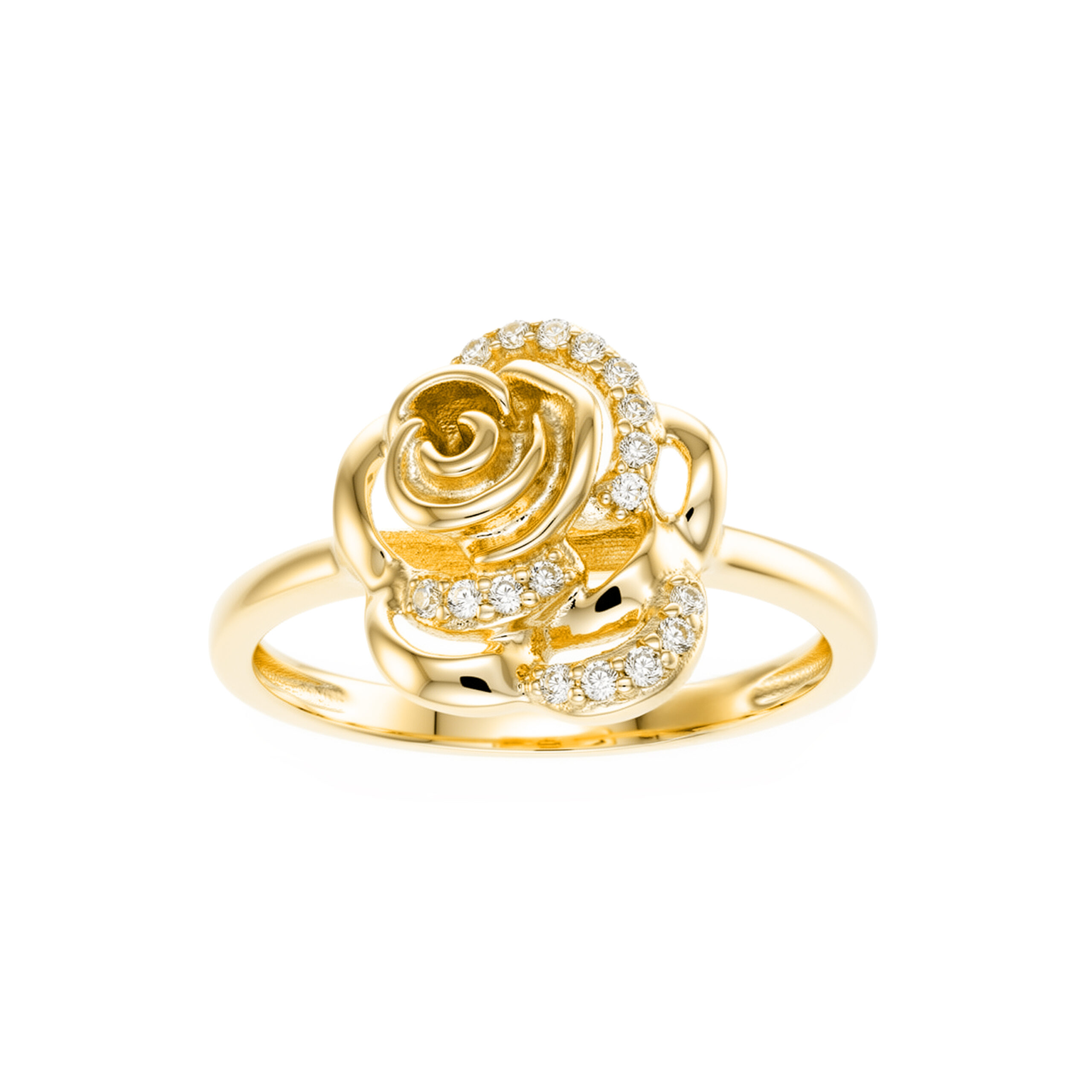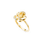 Acest inel rafinat din aur de 14K prezintă un design în formă de trandafir, unde petalele sculptate delicat sunt accentuate de pietre semiprețioase montate fin de-a lungul conturului. Detaliile tridimensionale și liniile fluide oferă un aspect romantic și elegant, perfect pentru ocazii speciale. Strălucirea caldă a aurului se îmbină armonios cu sclipirile pietrelor, transformând această piesă într-o bijuterie deosebită, plină de farmec și feminitate.
