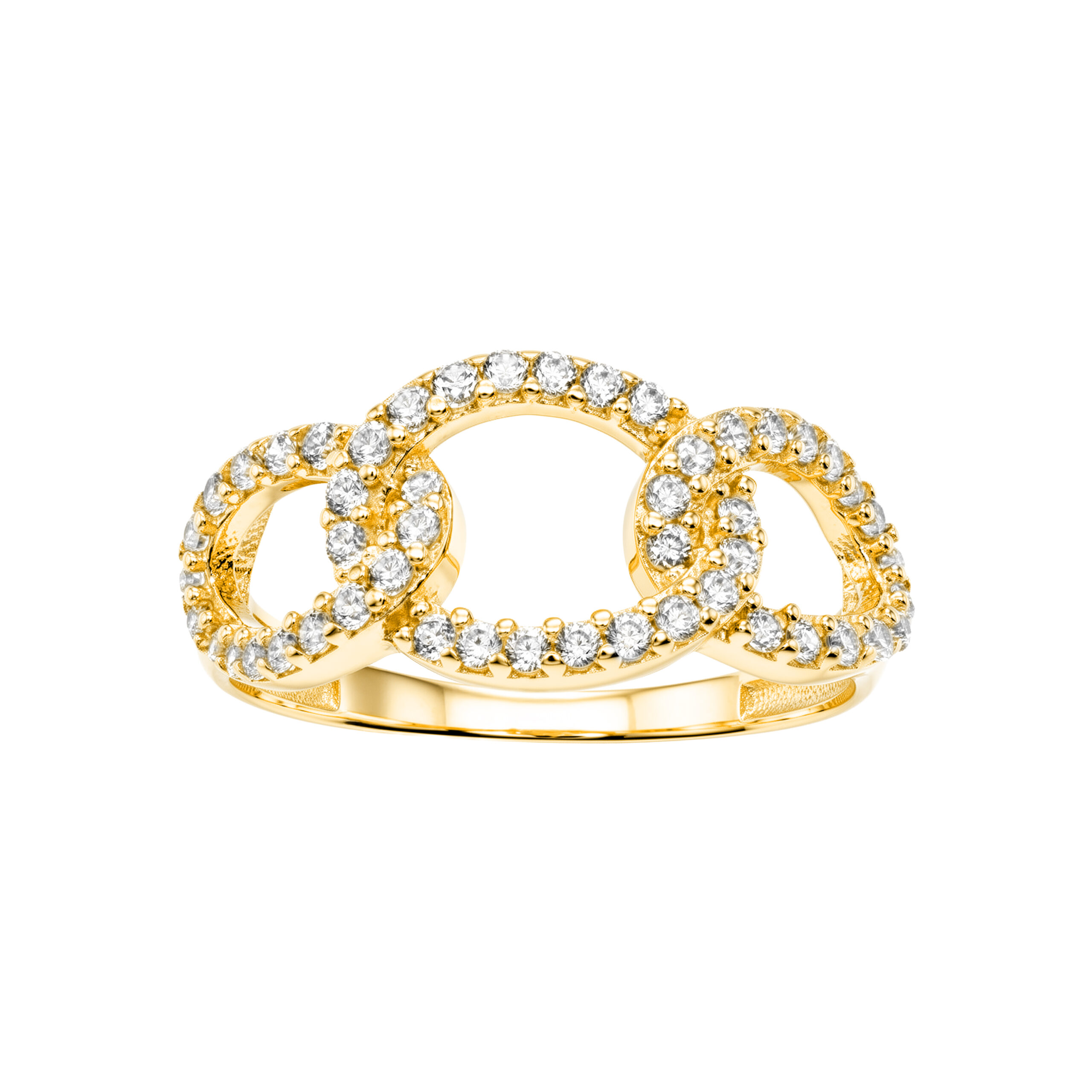 Acest inel elegant din aur de 14K prezintă trei elemente ovale împletite, fiecare decorat cu pietre semiprețioase montate fin pentru un efect strălucitor.