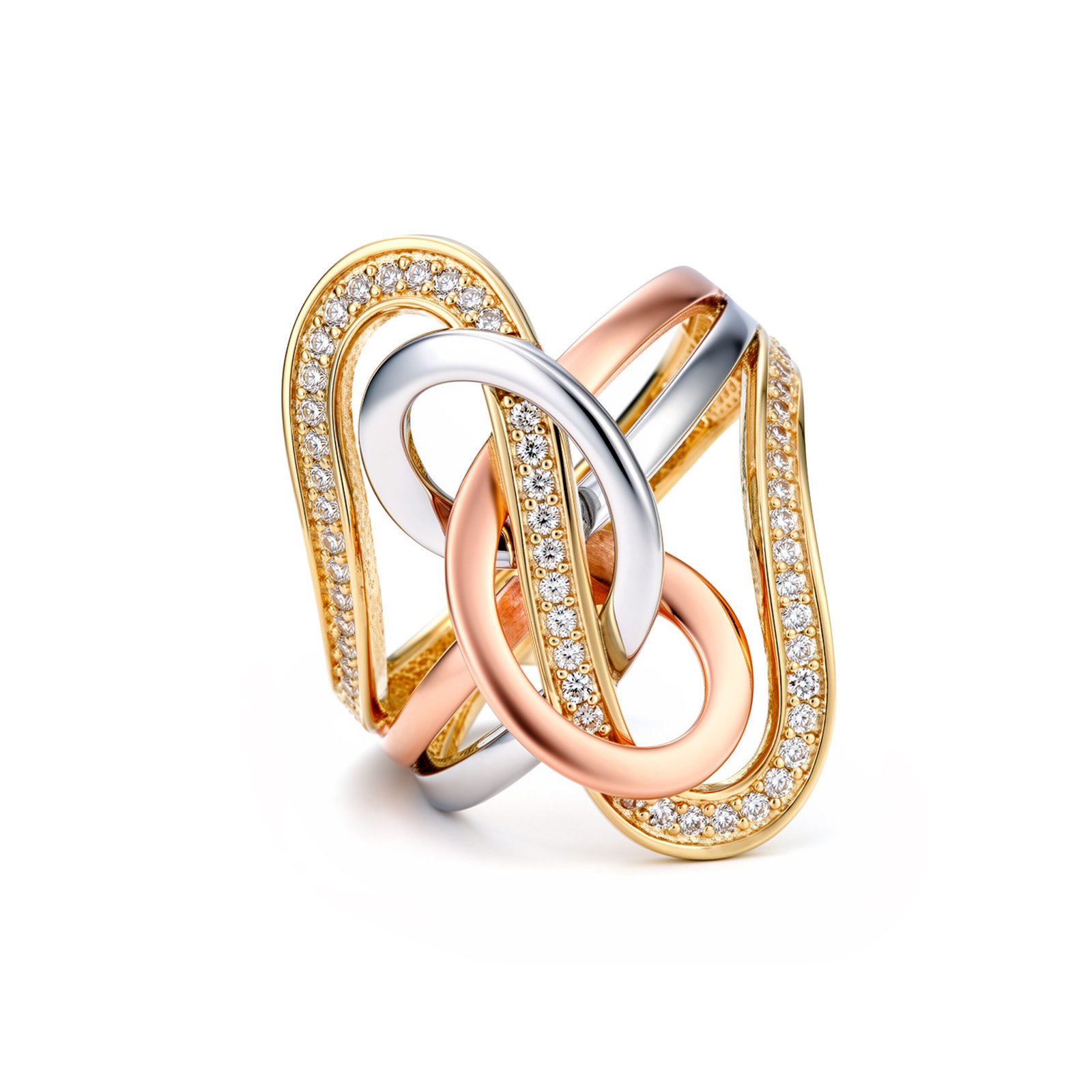 Realizat din aur de 14K în trei nuanțe – galben, alb și roz – acest inel impresionează prin designul său împletit în formă de nod. Detaliile fine cu accente strălucitoare adaugă profunzime și rafinament, transformând bijuteria într-o piesă elegantă, cu simbolistică puternică și stil contemporan.