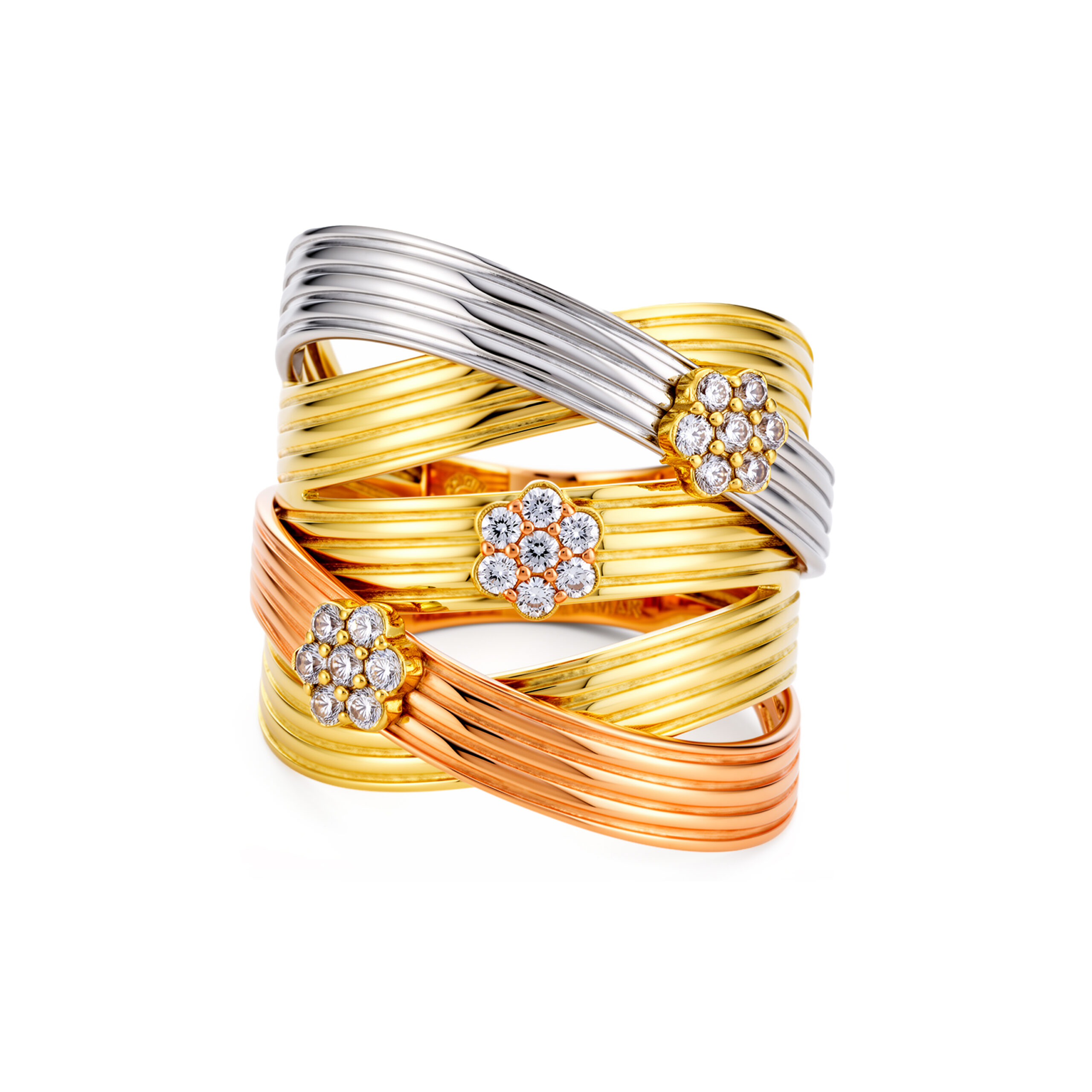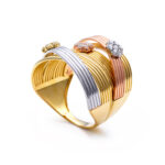 Acest inel tricolor din aur de 14K impresionează prin designul său stratificat și jocul armonios dintre aur galben, alb și roz. Liniile fine, dispuse în straturi paralele, sunt completate de detalii strălucitoare care adaugă profunzime și eleganță. O bijuterie sofisticată, creată pentru femeile care apreciază designul complex și expresiv.