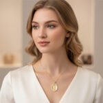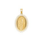 Medalion din aur 14K cu formă ovală și reprezentare religioasă centrală, decorat cu pietre semiprețioase montate uniform. Design clasic, potrivit pentru purtare zilnică sau ocazii speciale.